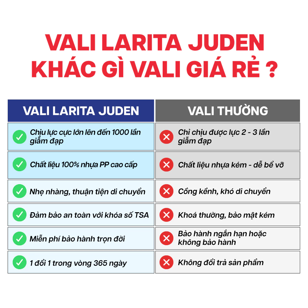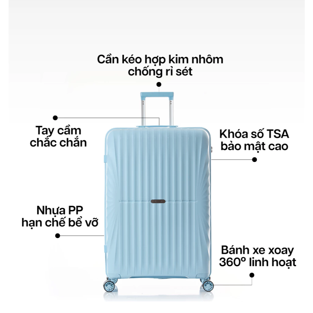 Điểm nhấn đặc biệt của vali là hệ thống khóa TSA tích hợp, mang đến sự an tâm tối đa khi bạn di chuyển qua các sân bay quốc tế. Khóa TSA không chỉ tăng tính bảo mật mà còn được thiết kế phù hợp với các tiêu chuẩn an ninh hàng không toàn cầu. Cùng với đó, sản phẩm được bảo hành trọn đời, minh chứng cho cam kết chất lượng và niềm tin của chúng tôi dành cho khách hàng. Không chỉ là một món đồ dùng, vali Nhựa PP siêu bền còn là người bạn đồng hành đáng tin cậy trên mọi cung đường.