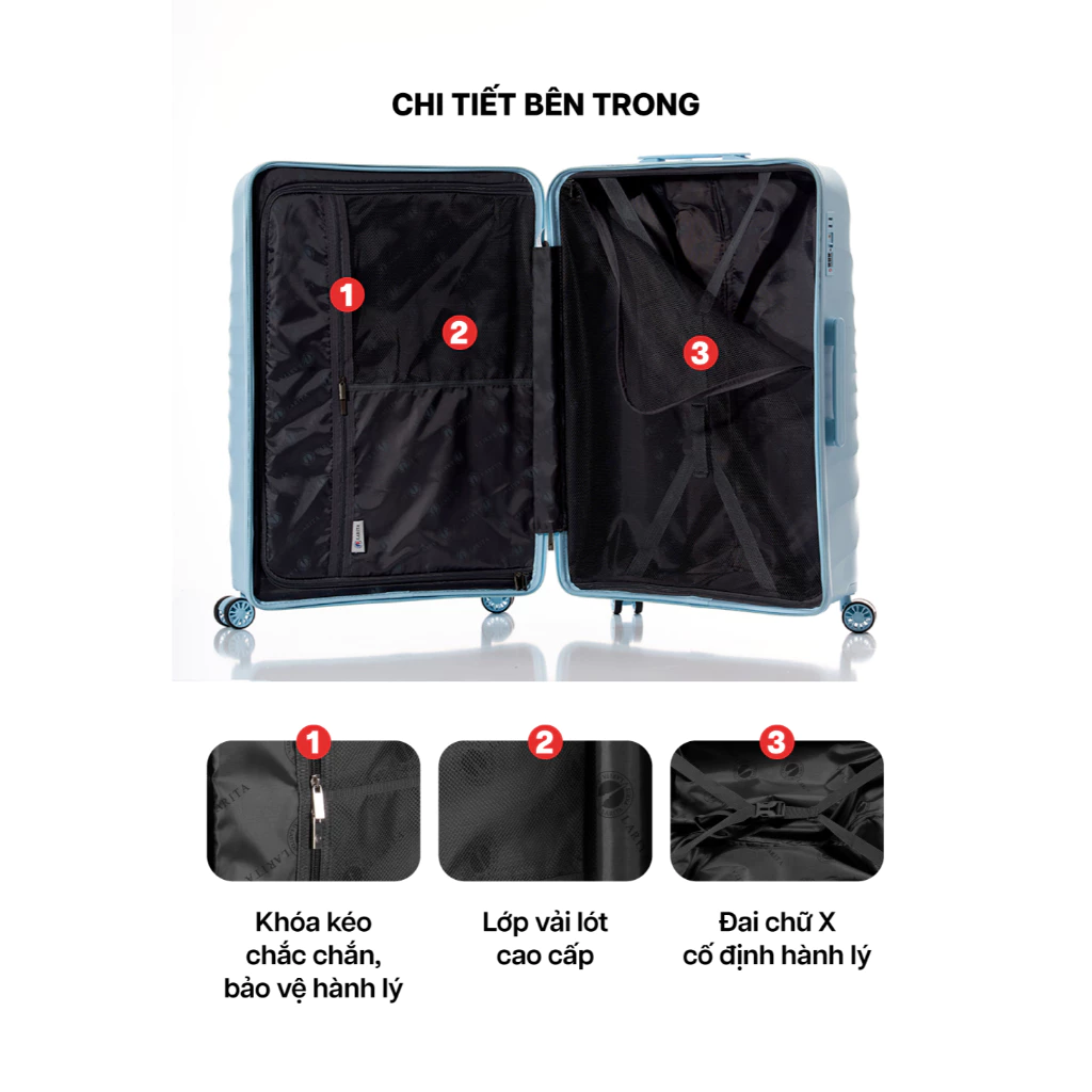 Bên cạnh những tính năng nổi bật kể trên, vali còn mang lại trải nghiệm sử dụng thuận tiện với nội thất rộng rãi, các ngăn chứa được thiết kế khoa học giúp bạn tối ưu hóa không gian. Từng chi tiết của vali đều được chăm chút kỹ lưỡng để mang lại giá trị sử dụng cao nhất. Hãy để vali Nhựa PP siêu bền cùng bạn trải nghiệm mọi hành trình, không chỉ bằng sự bền bỉ mà còn mang đến phong cách và sự tiện nghi mà bạn xứng đáng hưởng thụ.